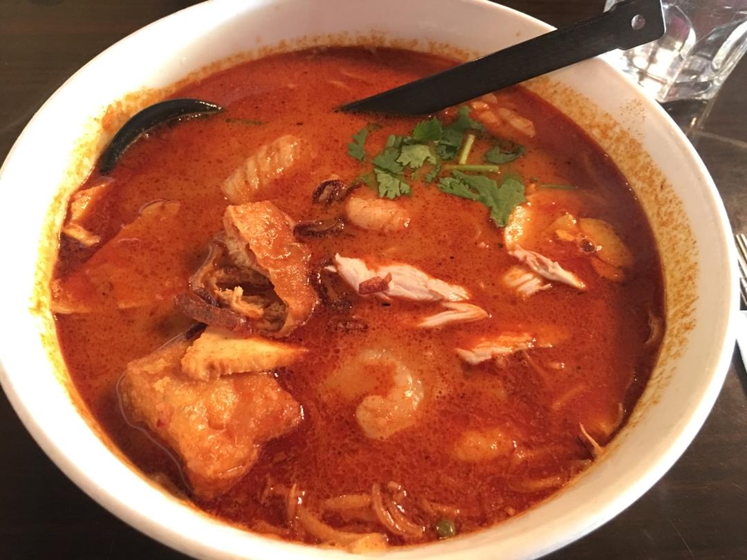今天中午外食的asam seafood laksa,满满的海鲜,真的是美味到回国前必须再特地去打卡的地步(o^^o) #...