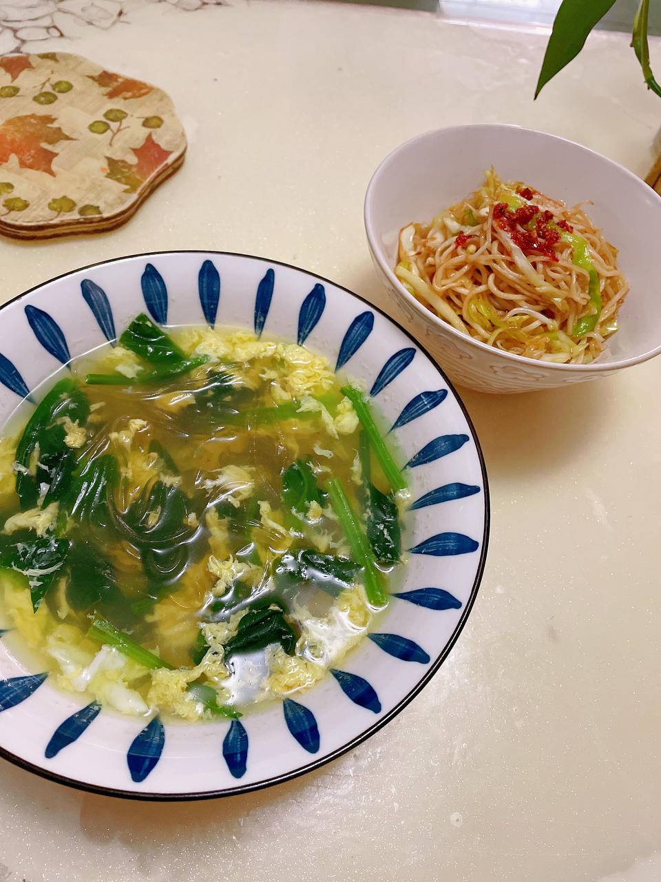 早午餐 包菜豆芽炒面➕菠菜鸡蛋汤🥣