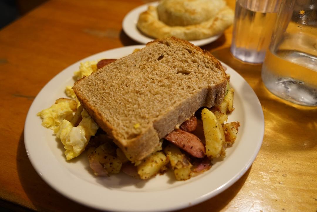 阿拉斯加Talkeetna市一家叫Roadhouse的餐厅 典型美式早餐 炒蛋面包和土豆 还点了一个三文鱼的派 里面还有...