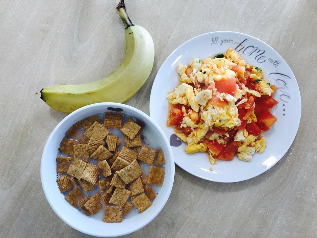 牛奶麦片+番茄炒蛋+水果