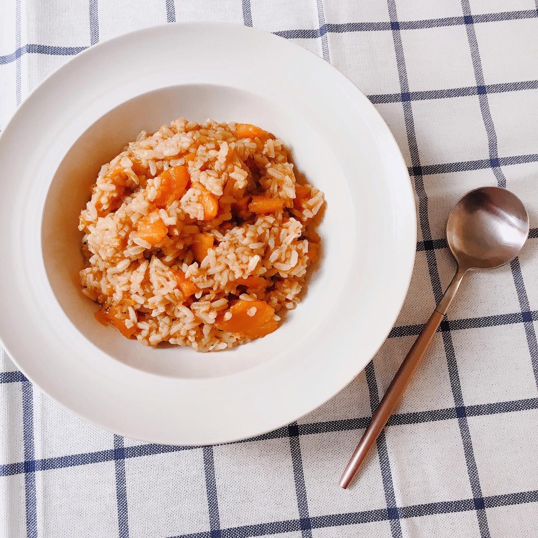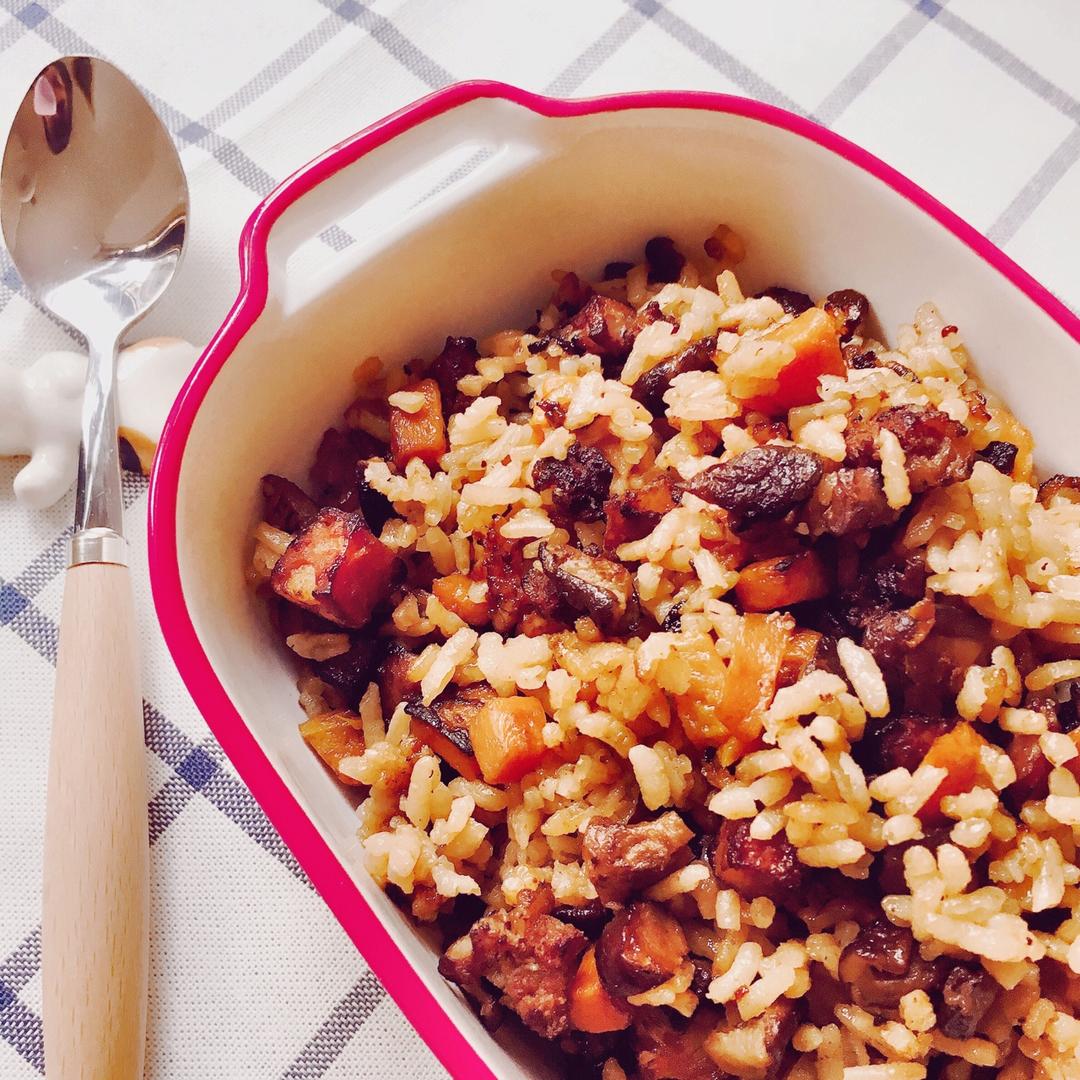 用的台式烤肠和牛肉肠代替的腊肠,香菇胡萝卜加上烤肠一起做的焖饭又简单又方便早上起床弄一下就...