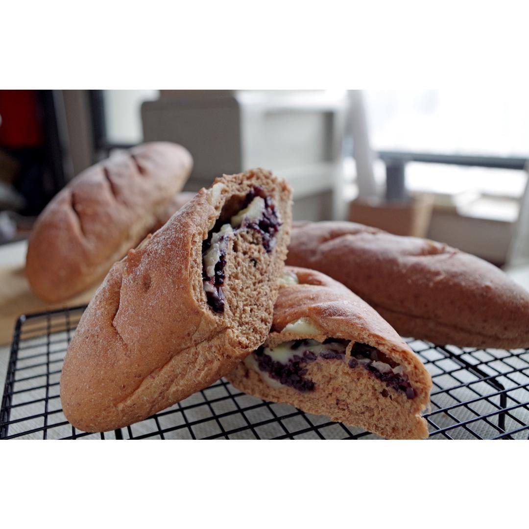 用的这个方子的可可面团,卷的奶酪紫米,但是紫米不够甜,吃得我有点心塞…