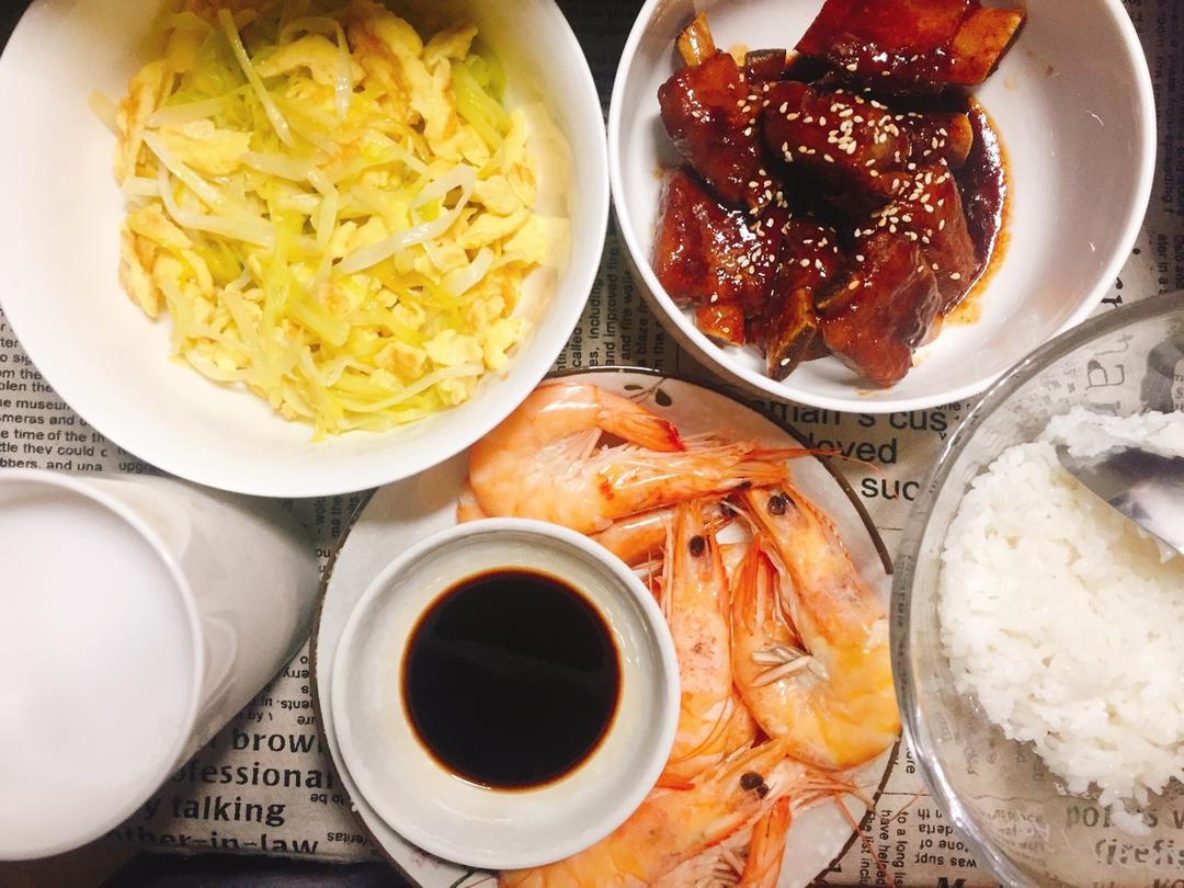 酱排骨+白灼虾+韭黄炒蛋(๑•́₃•̀๑)