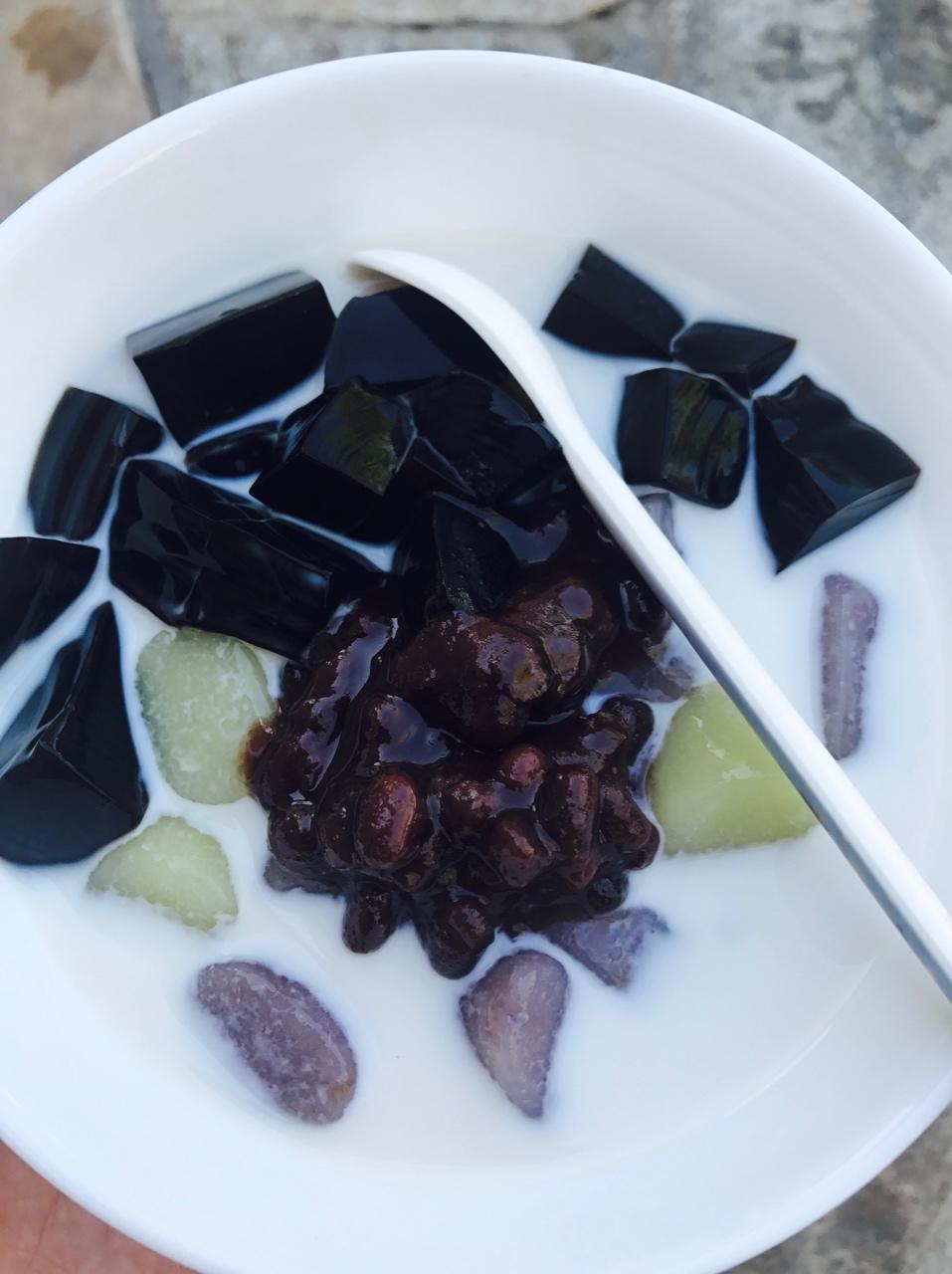 自制的红豆麦片芋圆加抹茶豆腐和豆奶,健康又好吃!