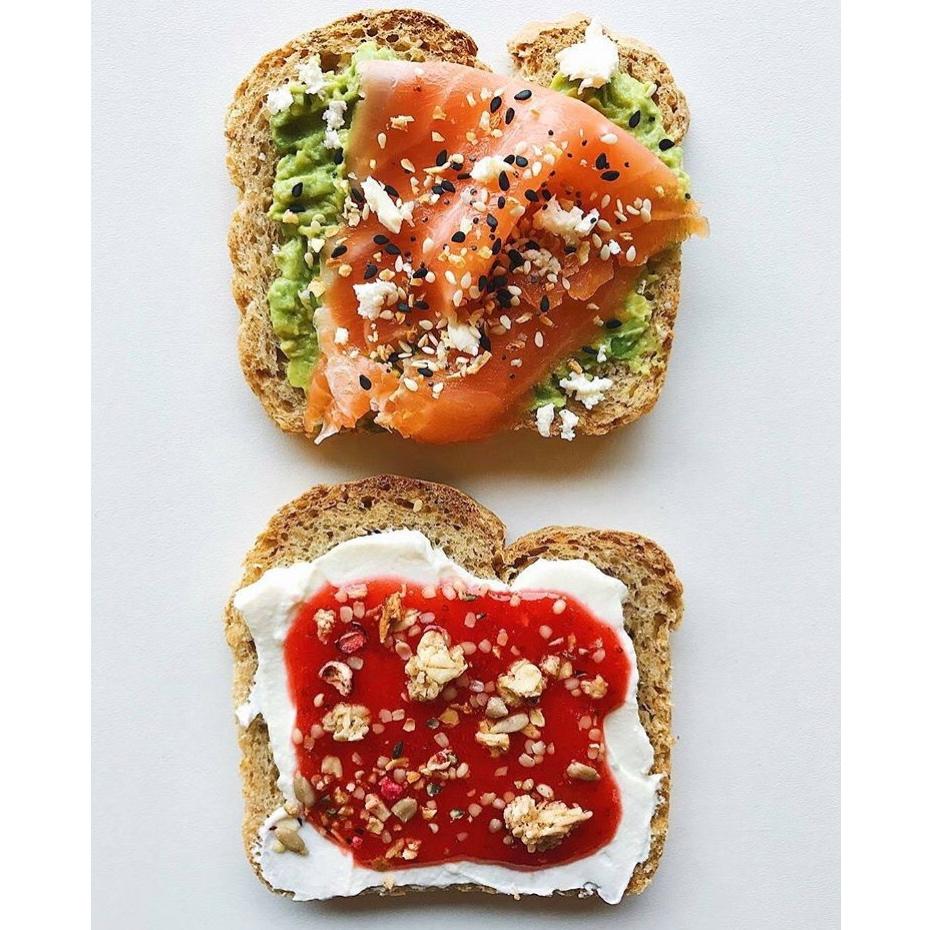 上:牛油果泥+烟熏三文鱼+芝麻+奶酪