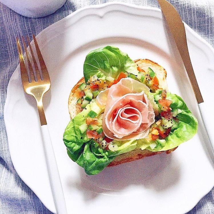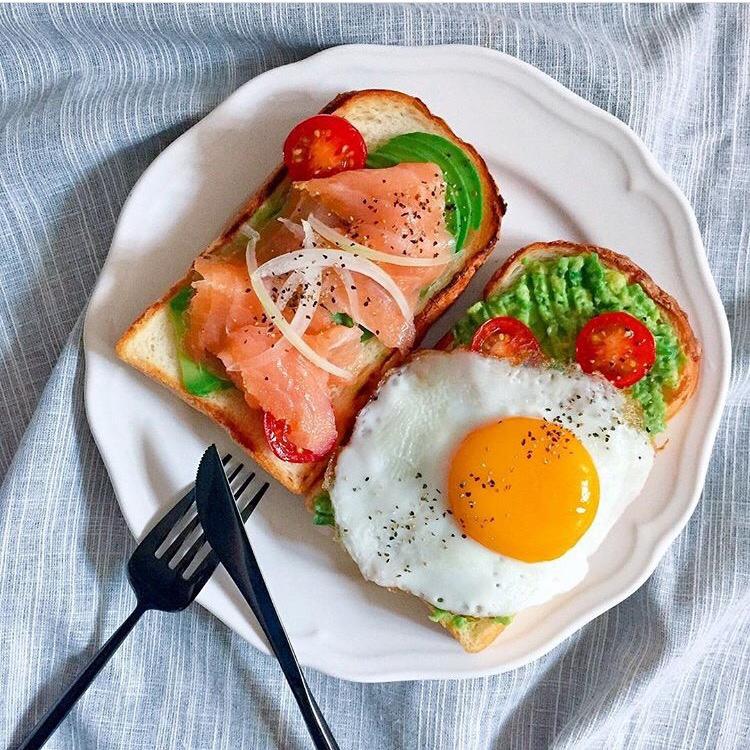 烤吐司+三文鱼+牛油果+圣女果+煎蛋+洋葱+芝麻黑胡椒