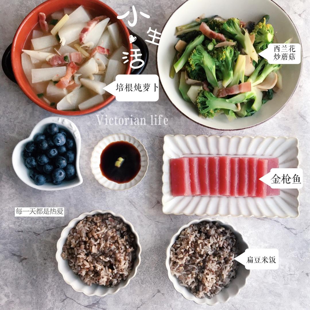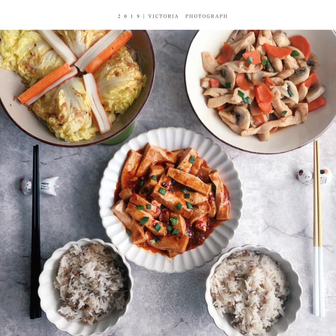 蒜蓉粉丝娃娃菜(脑子有坑摆了两根蟹肉棒上去),鸡胸肉蘑菇,红烧豆腐,扁豆饭。