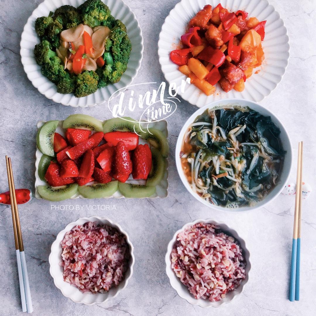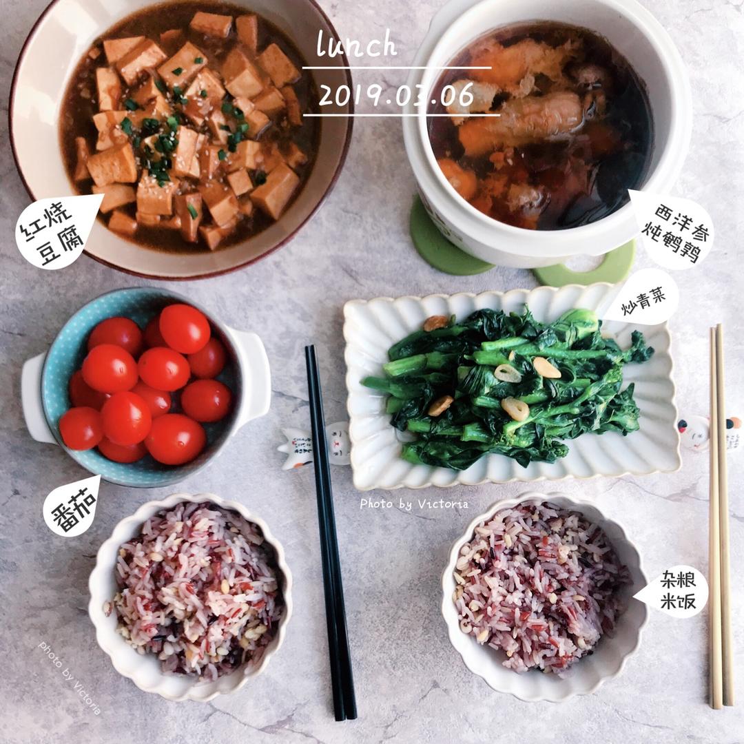 炖鸽子汤,木耳炒山药,皮蛋豆腐,糙米饭,水果。