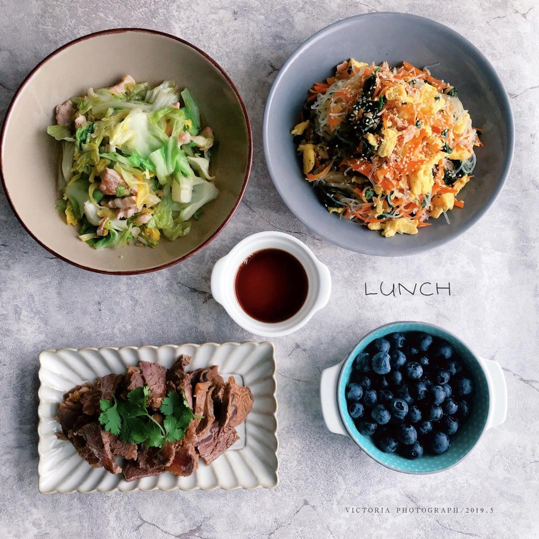春雨沙拉,炒球菜,卤牛肉,蓝莓,糙米饭。