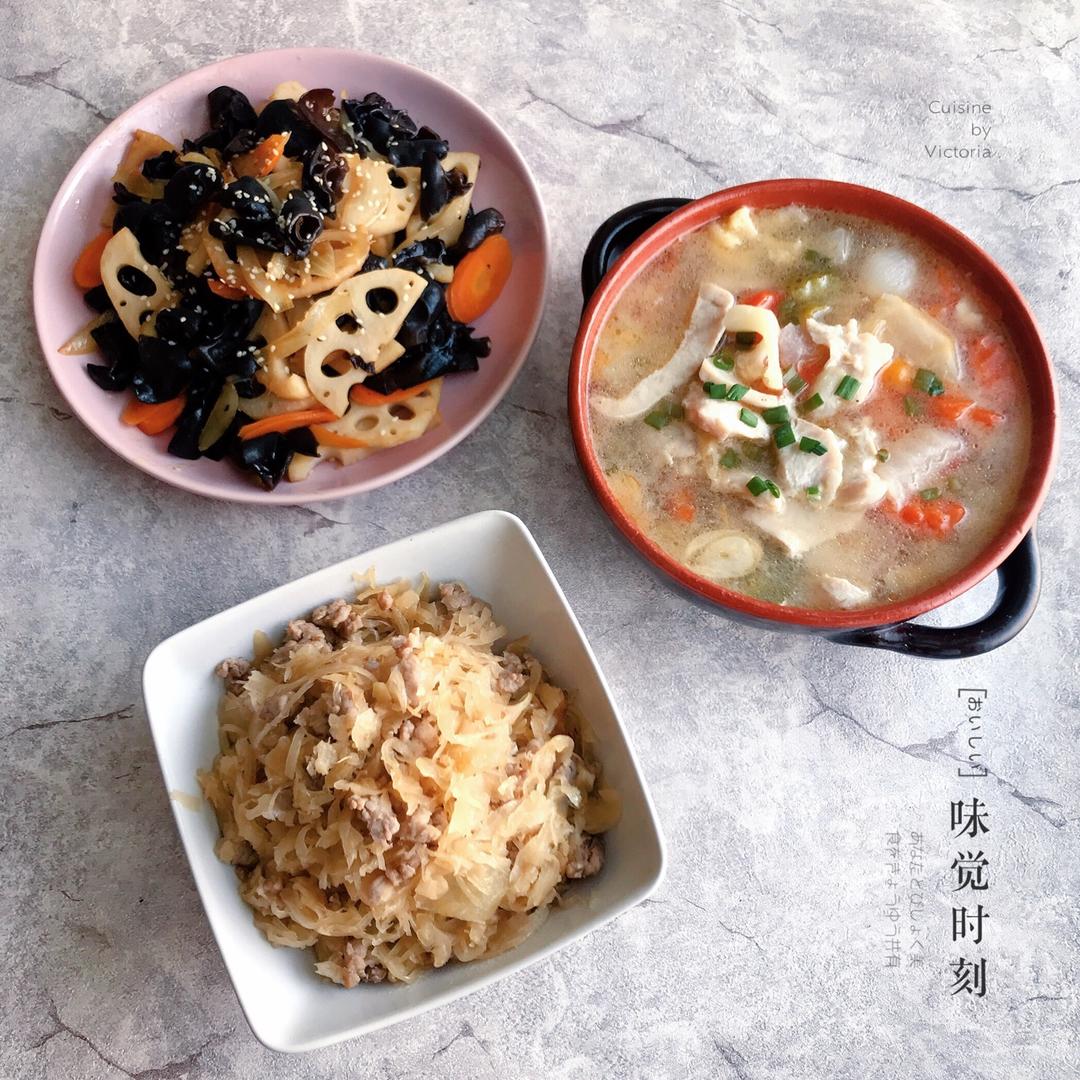 木耳炒藕片,酸菜鱼汤,腌球菜炒肉。逛超市的时候挖到的宝,罐头装的腌球菜,跟自家腌的球菜咸菜...