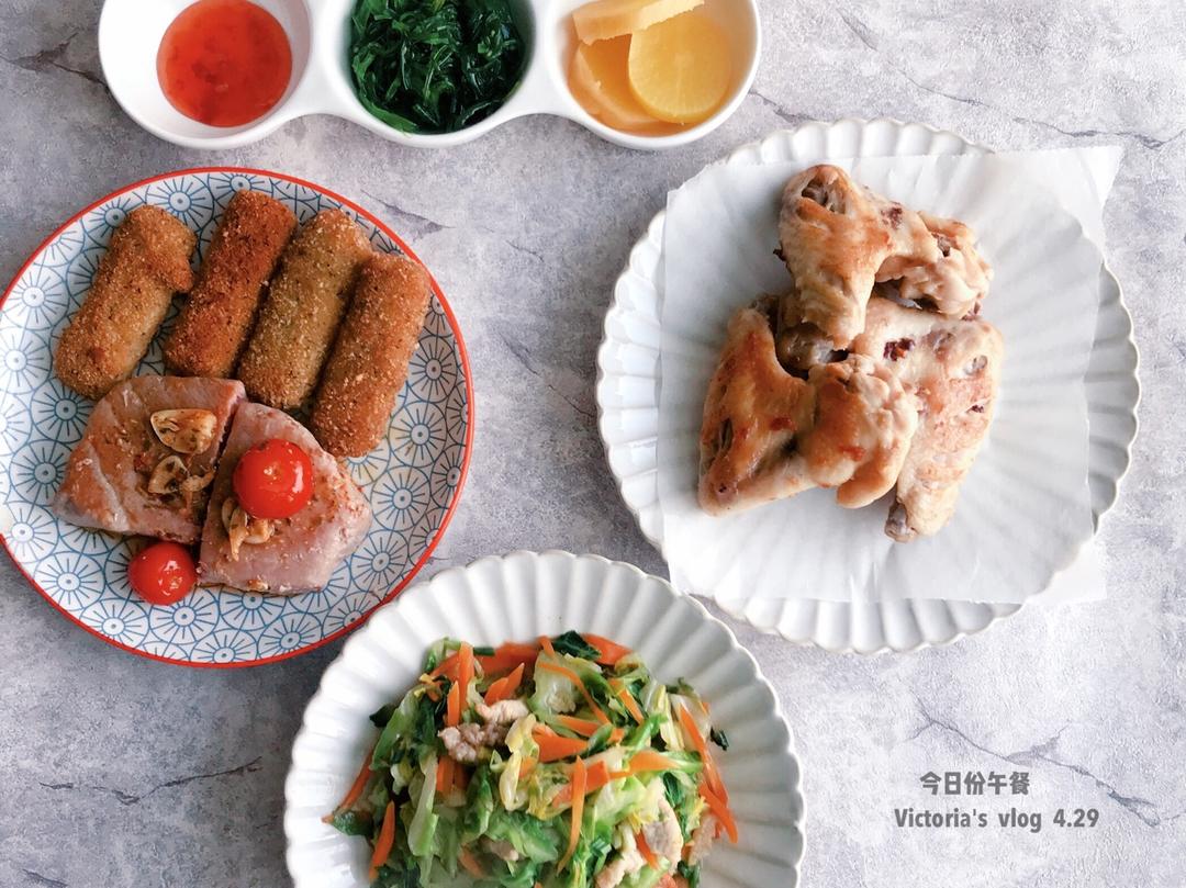金枪鱼肉,炸蔬菜条,煎鸡翅,炒球菜丝。今天的鸡翅腌的有点咸。