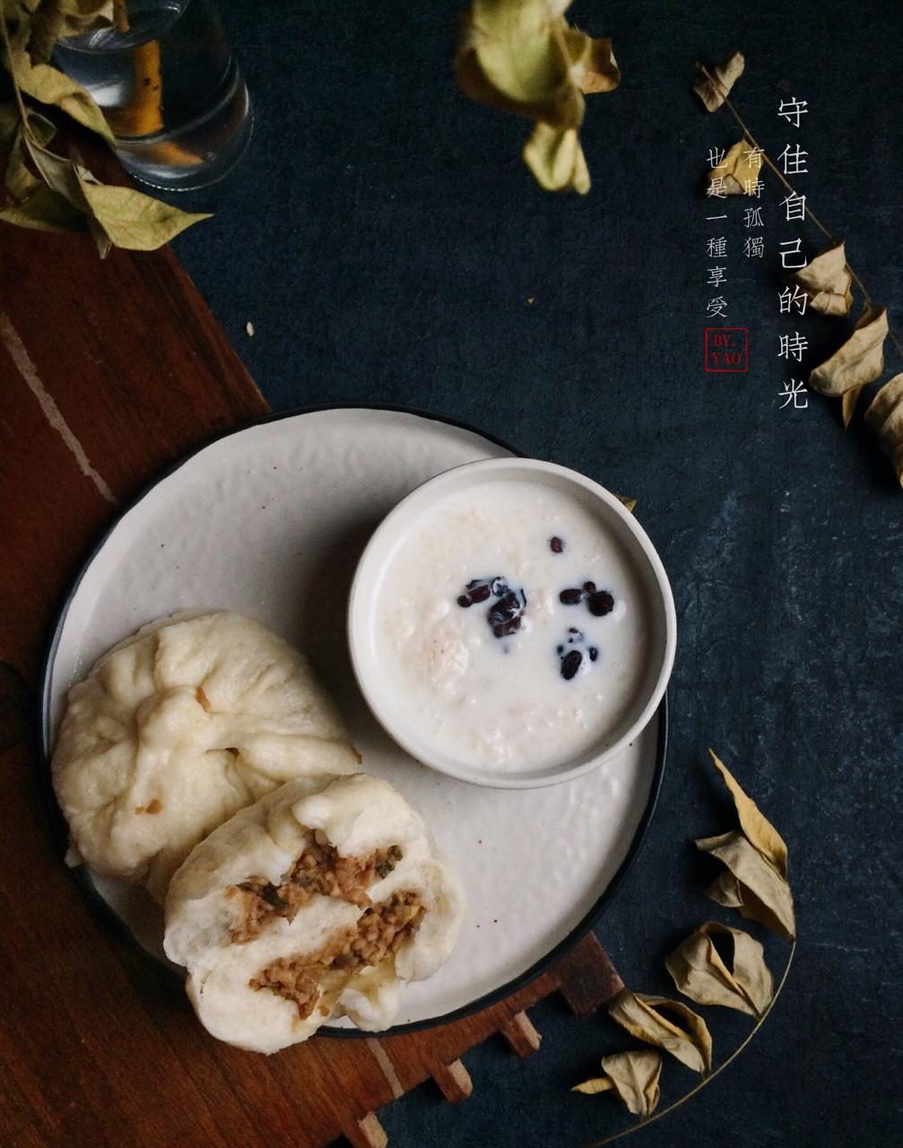 早食。酱肉洋葱玉米粒包子➕红豆酒酿牛奶