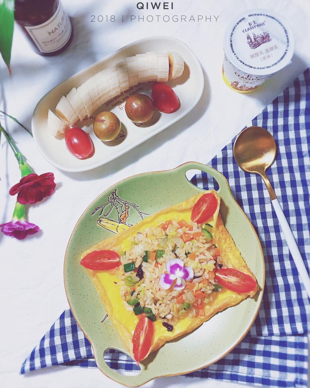 ☑︎ 开放式蛋饼五彩炒饭+香蕉+李子+圣女果+酸奶