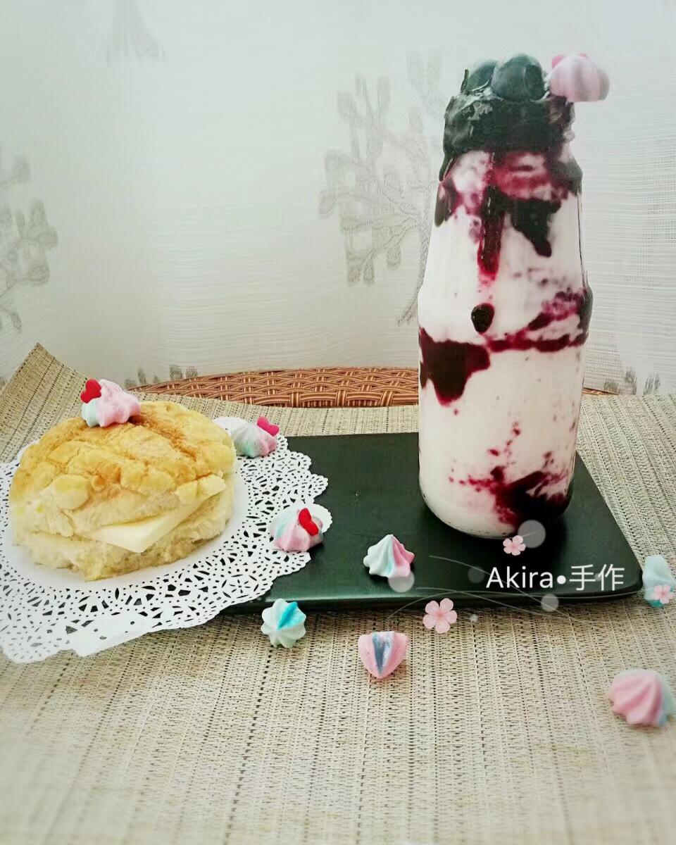 自制菠萝包夹黄油再配上蓝莓酸奶