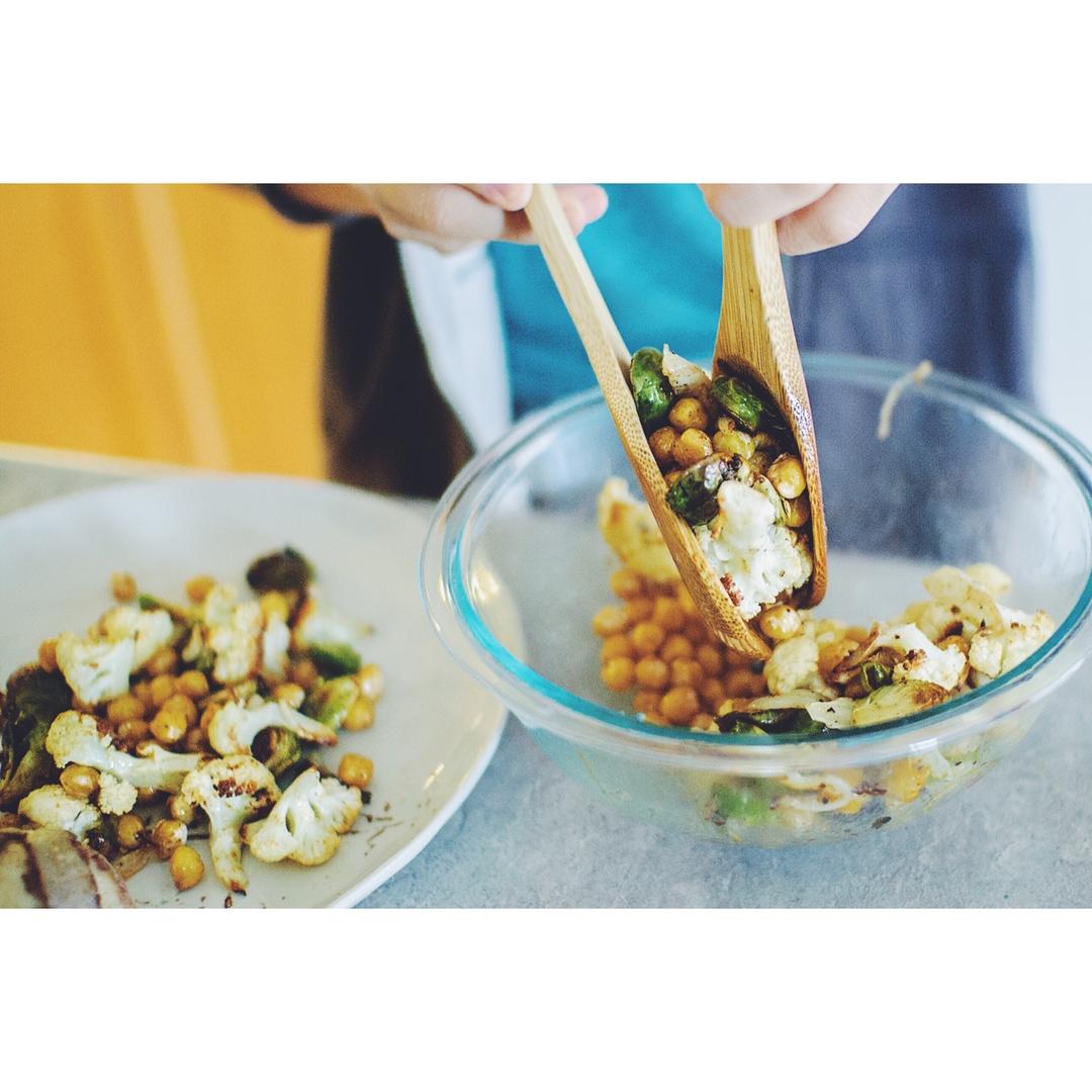 鹰嘴豆配烤蔬菜,再加上自调麻酱汁的沙拉,非常好吃😋😋