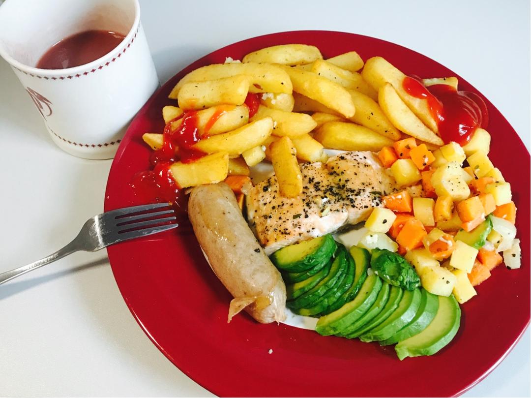 烤三文鱼配牛油果&英式薯角🍟