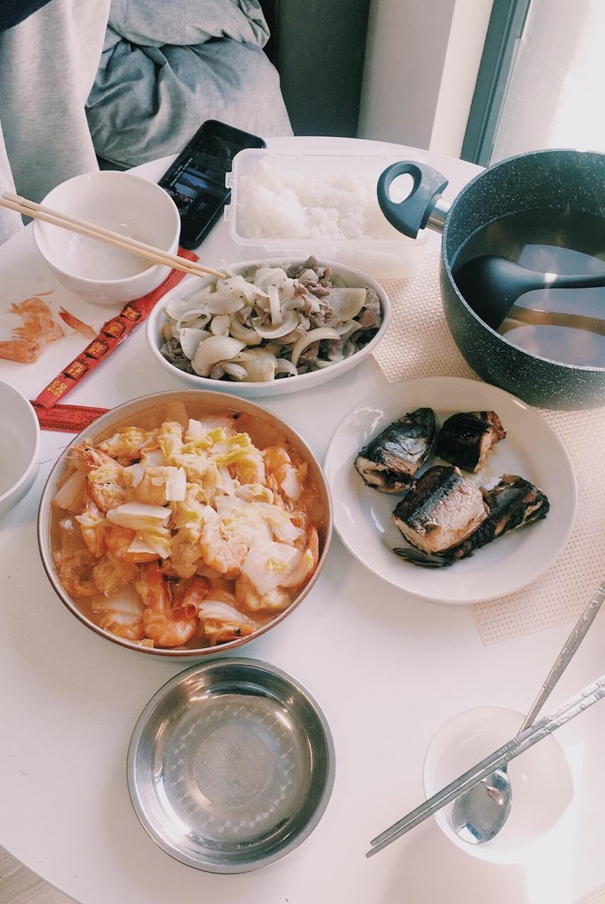 白菜大虾,有点像秋刀鱼的鱼,羊肉