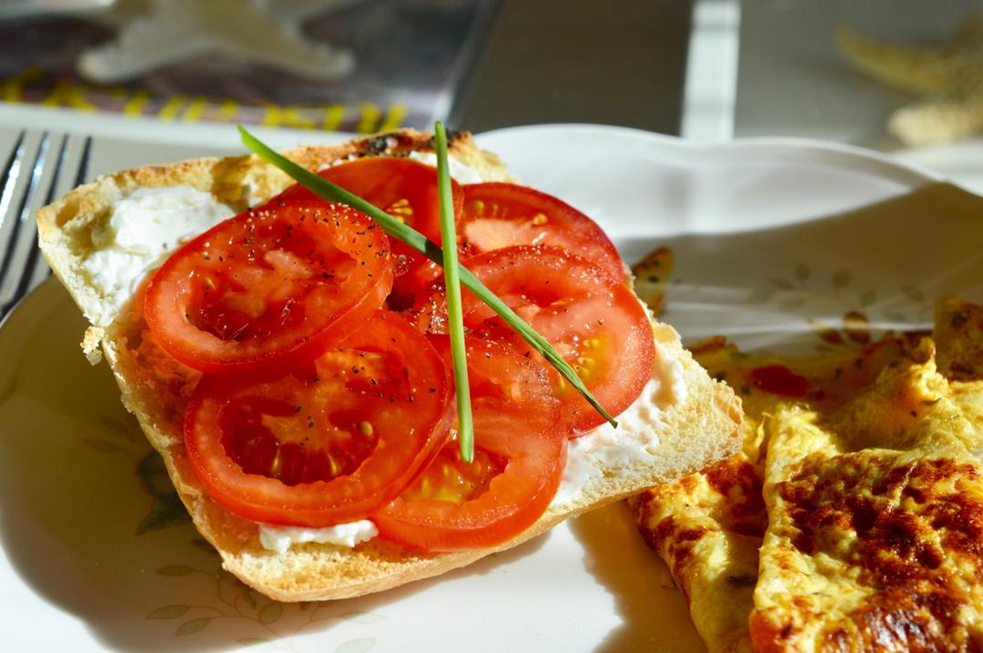 意大利小番茄奇巴塔面包配煎鸡蛋。
