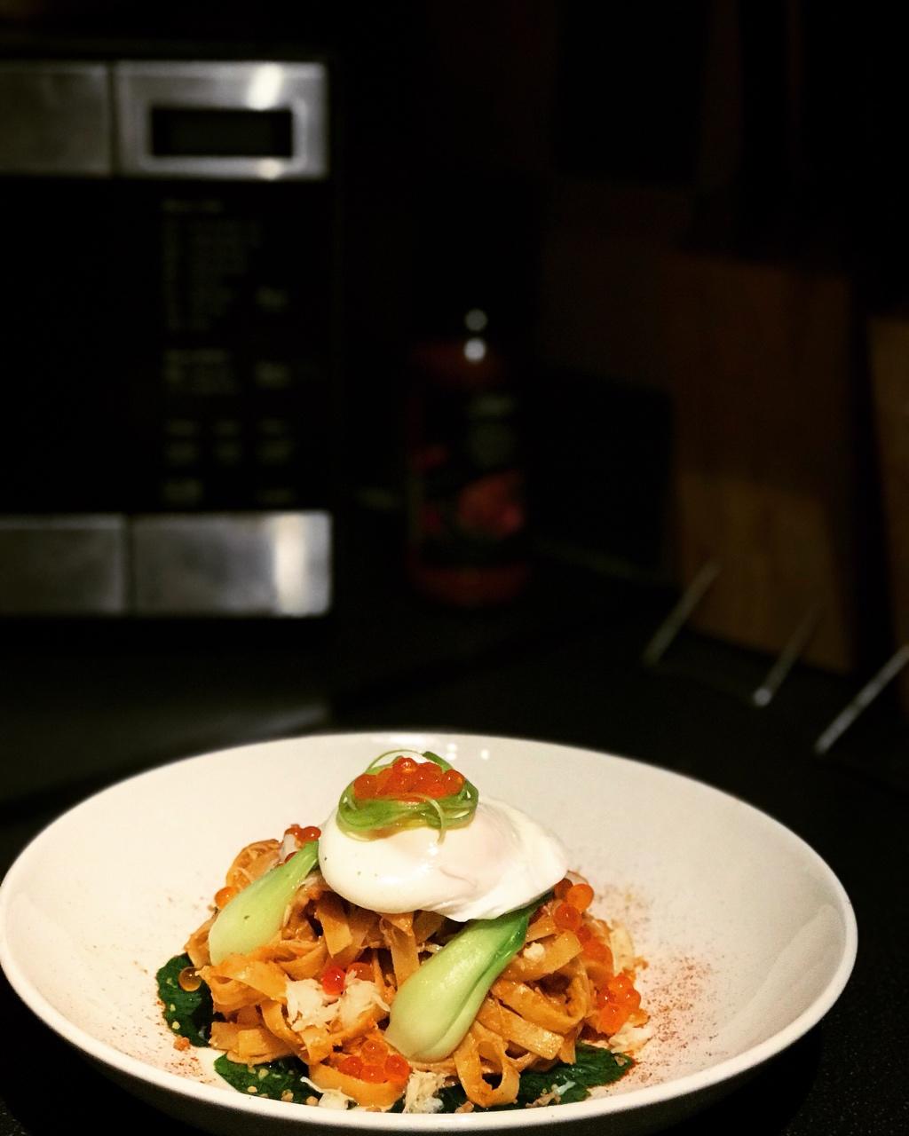 今天升级版,蟹粉葱油拌面。蟹肉蟹黄加食用油和姜丝翻炒片刻,加少许料酒和盐,味道太赞了,除了麻...