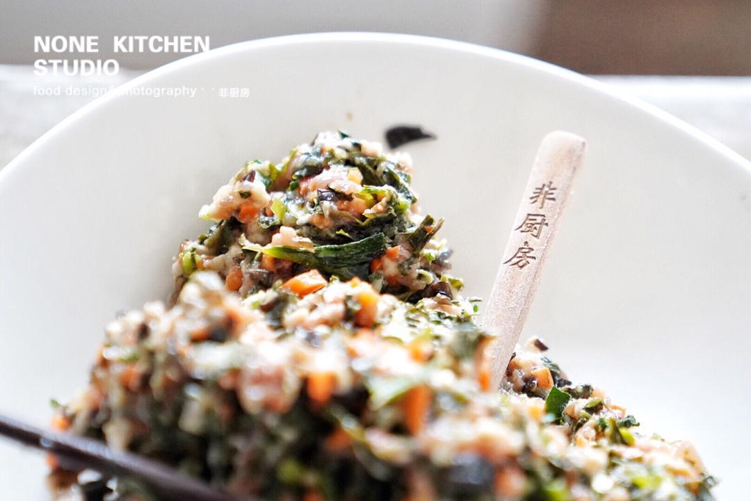 冬至,用野菜,胡萝卜,木耳,鸡蛋和猪肉,拌了麻油,糖盐姜末调成馅料。和好了面,包了跟包子...
