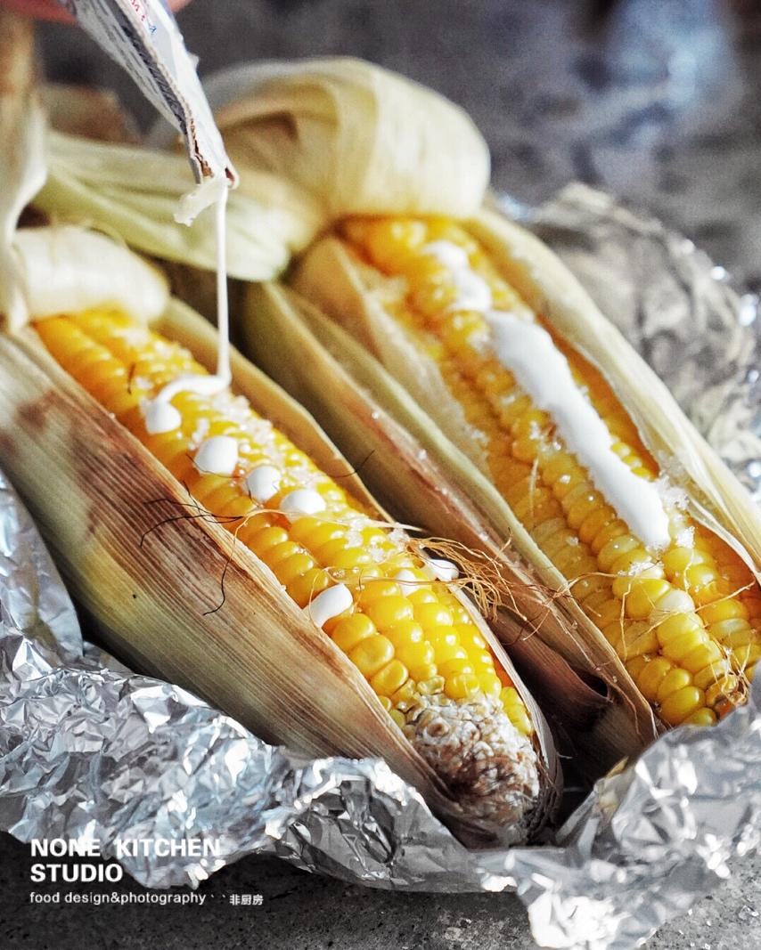 烤了玉米,淋上奶油和一小块安佳黄油,等融化就可以吃了!