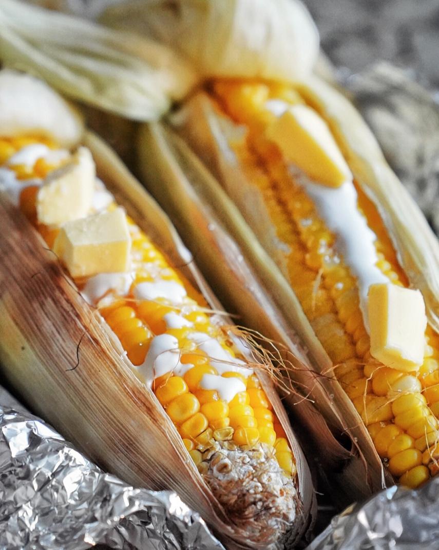 烤了玉米吃吃,淋上奶油和一小块黄油,等待融化!