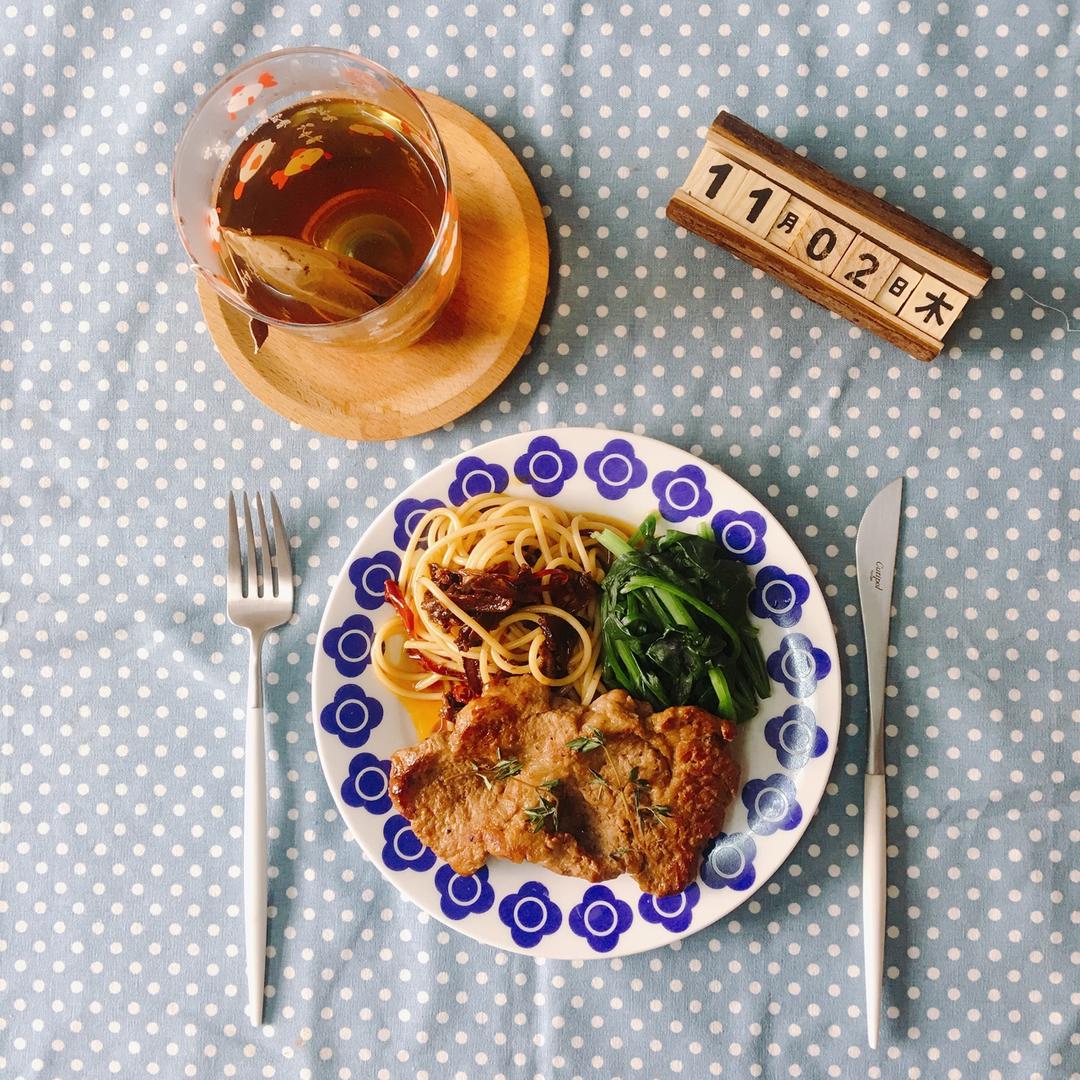 (2017.11.2)午餐一人食,煎猪扒,松茸油拌意面,烫菠菜,莓果红茶。是,中午和孩子早餐一样,早餐我买了...