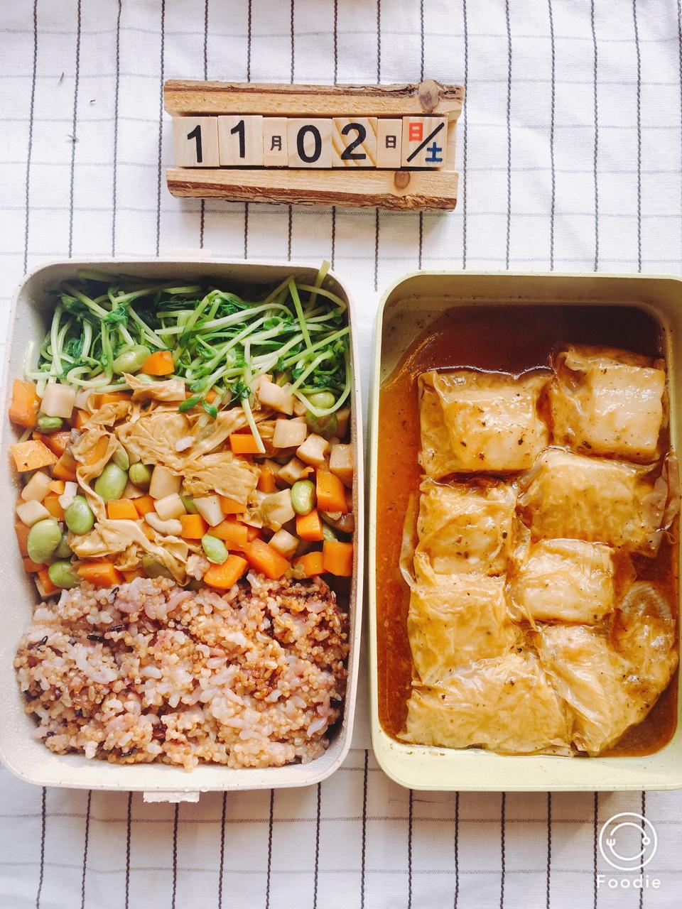 今日午餐:清蒸豆腐衣龙利鱼(一张豆腐衣,半条鱼柳),清炒胡萝卜杏鲍菇毛豆(一根胡萝卜一个杏鲍菇一把毛豆),一...