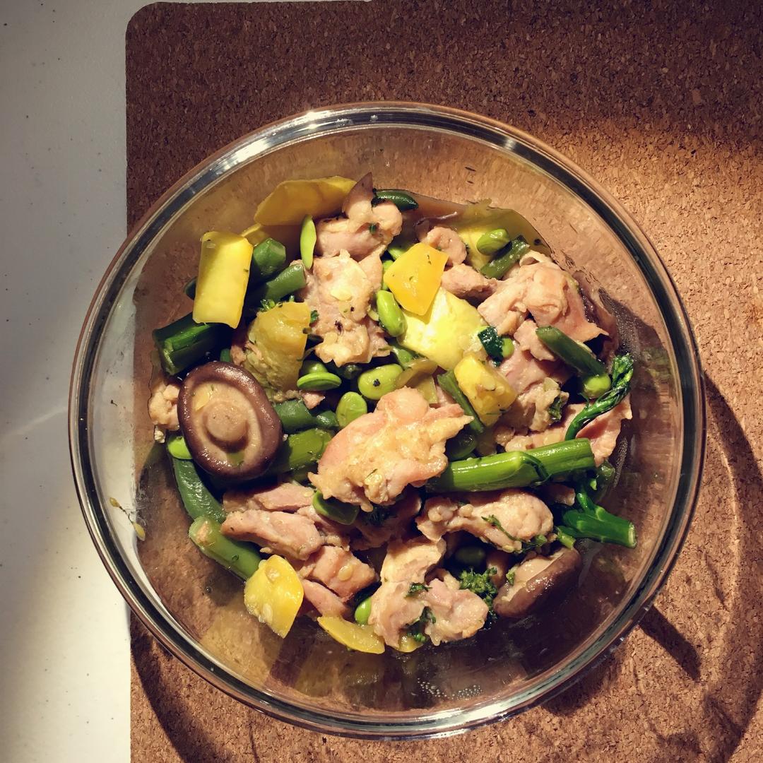 缺德舅的香菇毛豆鸡加了baby broccoli 和squash,炒了一大锅