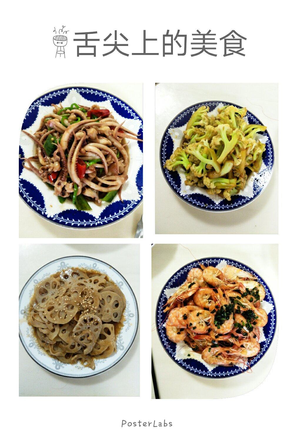 【午餐:爆炒鱿鱼足,干煸花菜,糖醋藕片,葱油虾】