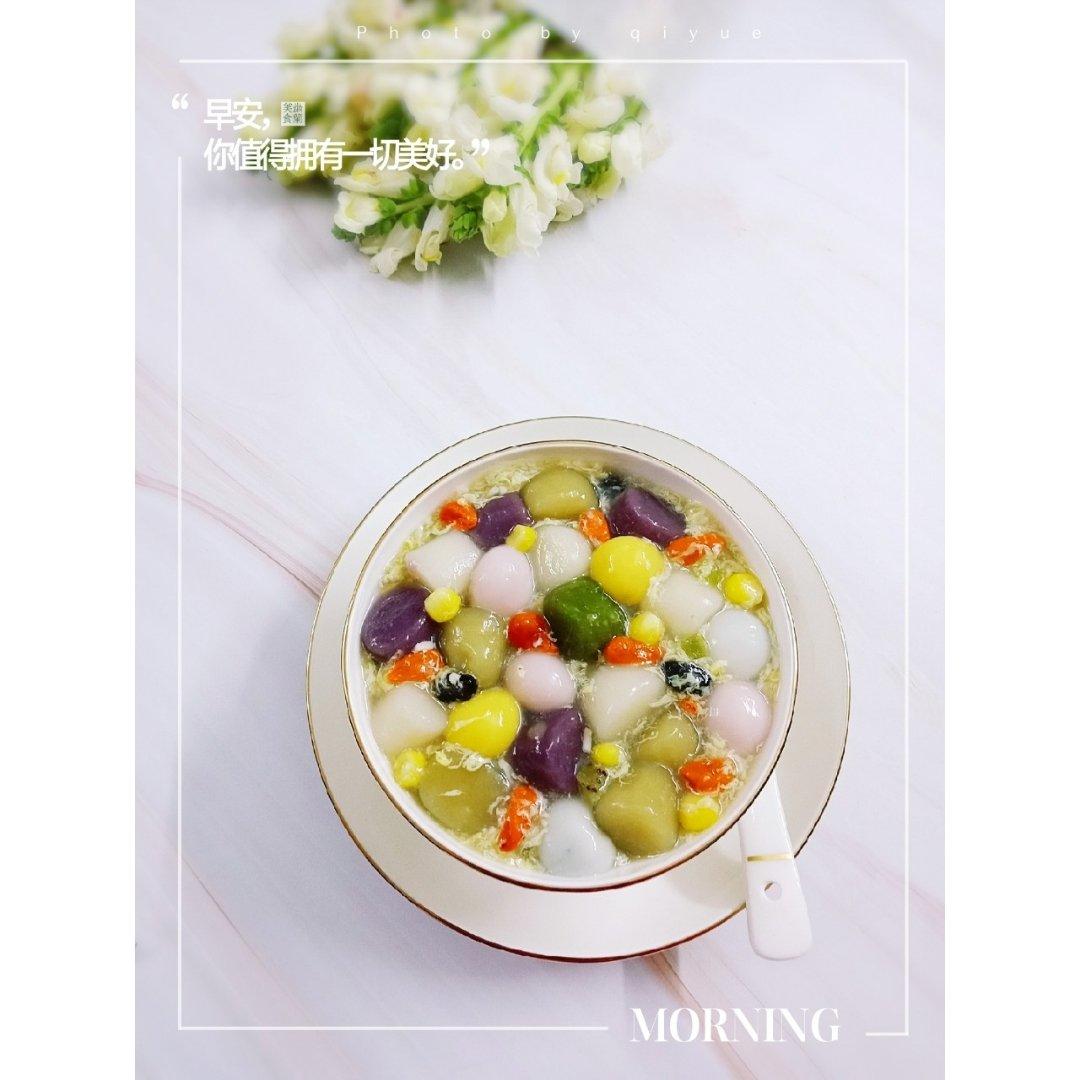 今日早餐~彩色蛋花芋圆(黑加仑,枸杞,玉米,鸡蛋,甜酒糟,红薯芋圆,淮山芋圆,菠菜芋圆,...