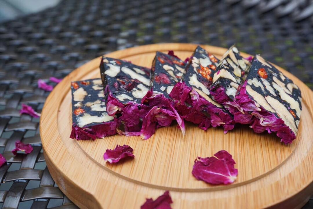 玫瑰花阿胶糕. 选用正宗东阿胶熬制.阿胶含量20%. 不是那种一看就是芝麻一片片的哈哈哈