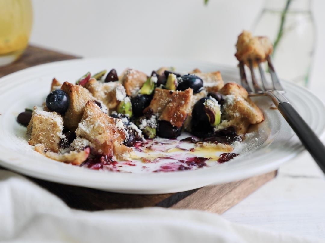 表面撒了我爱吃的巧克力和开心果,和烤过的吐司蘸着biu汁的蓝莓一起吃~超满足!