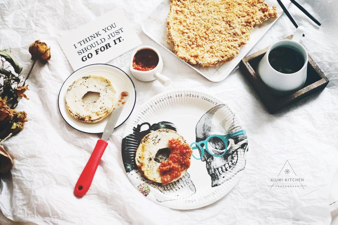自己做了一份酸辣酱,配着贝果吃很搭~