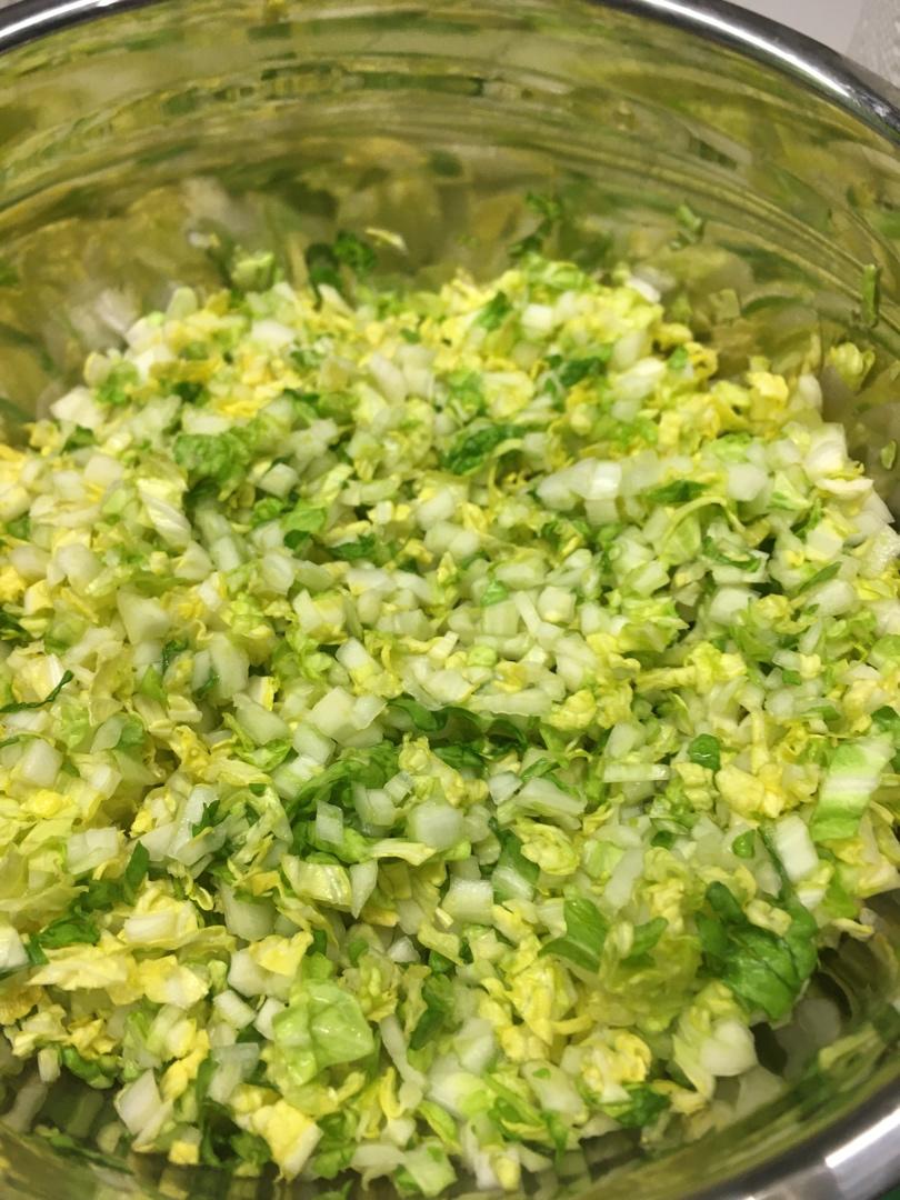 1、白菜没有过水,直接切碎了加盐半小时,挤干水份,拌入肉馅;