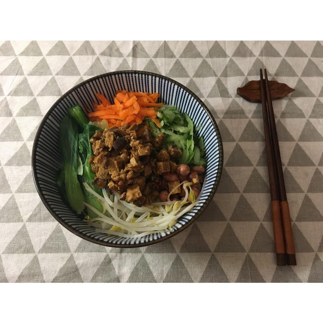 辣酱拌面+青菜+芦笋+煎蛋