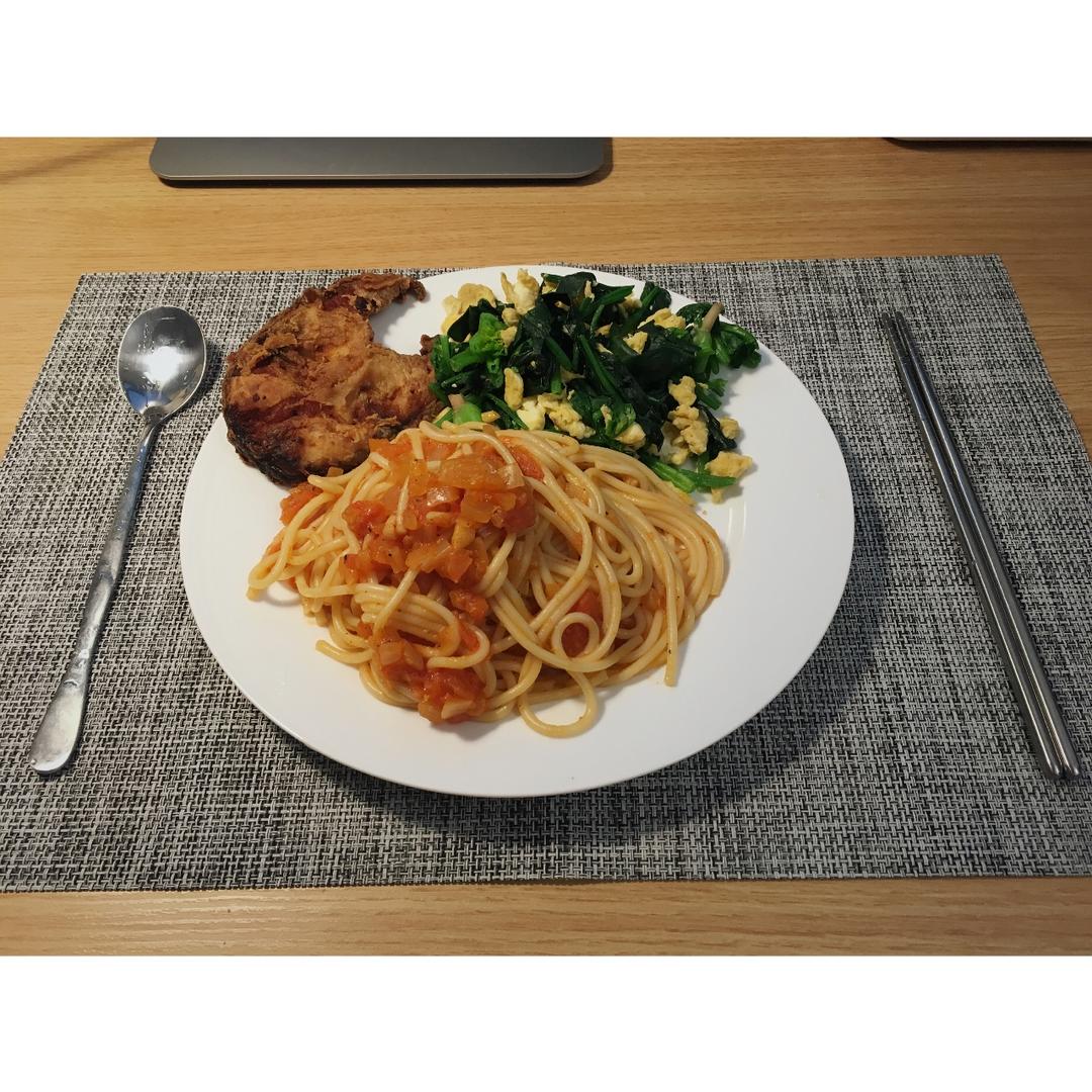 意面+菠菜炒蛋+熏鱼