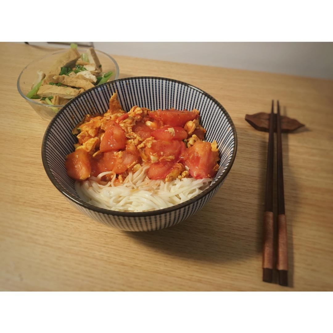 西红柿鸡蛋面+芹菜炒香干