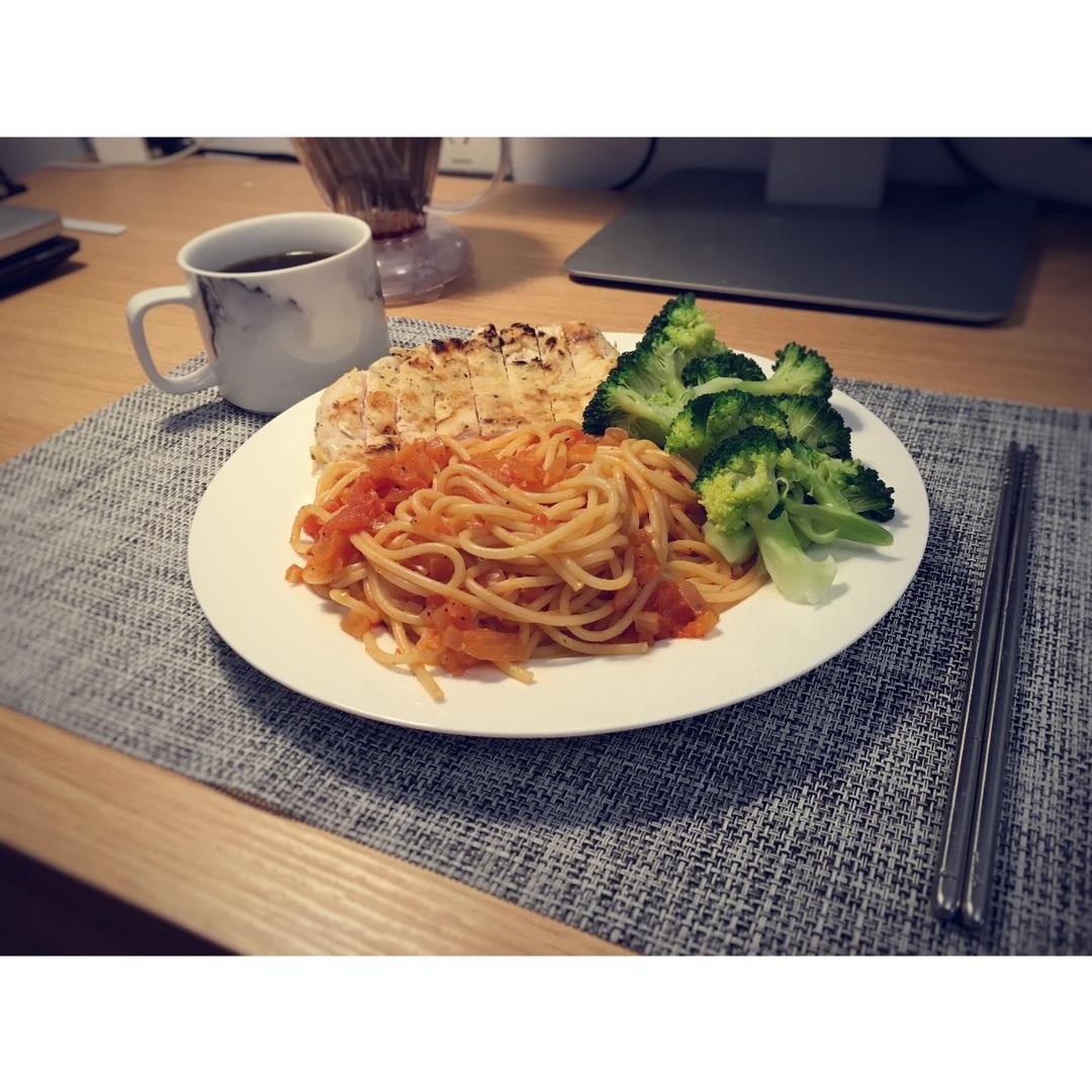 意面+鸡胸脯+西兰花+黑咖