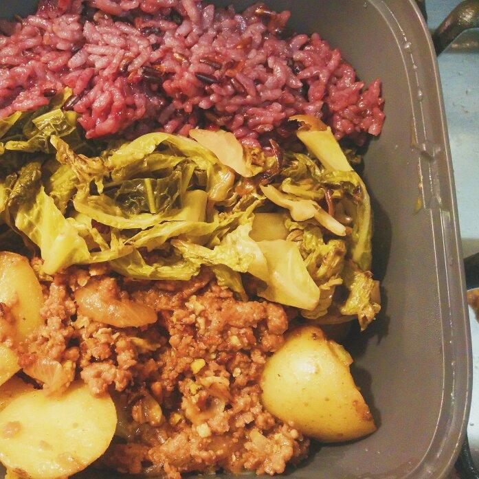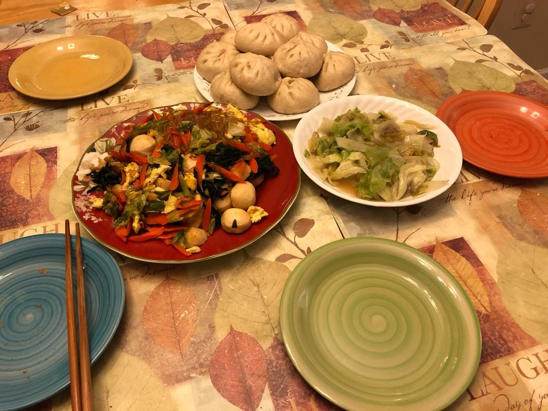 猪肉馅包子,浓墨重彩的包菜粉丝和轻描淡写的炒生菜……