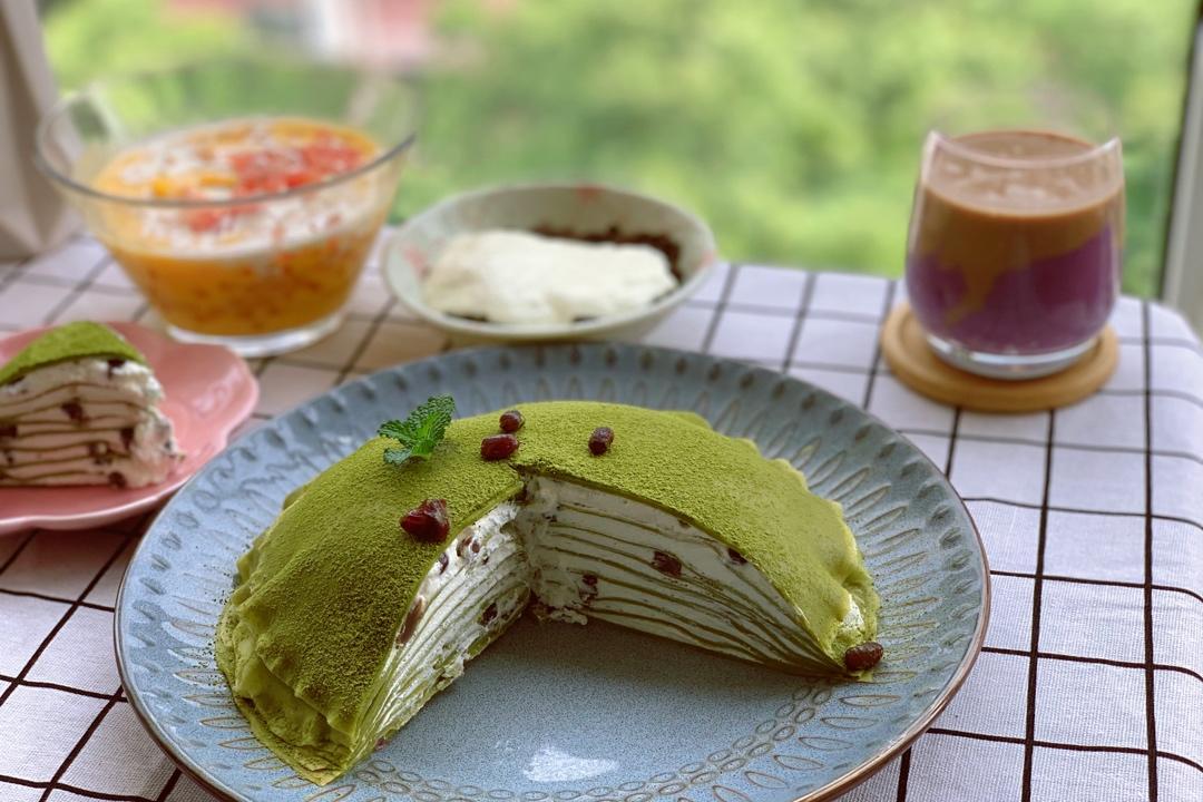 超丰盛下午茶!抹茶红豆千层、杨枝甘露、奥利奥鲜奶麻薯、芋泥奶茶。本来想做抹茶红豆毛巾卷的,结果皮子摊多了就临时改成了千层...