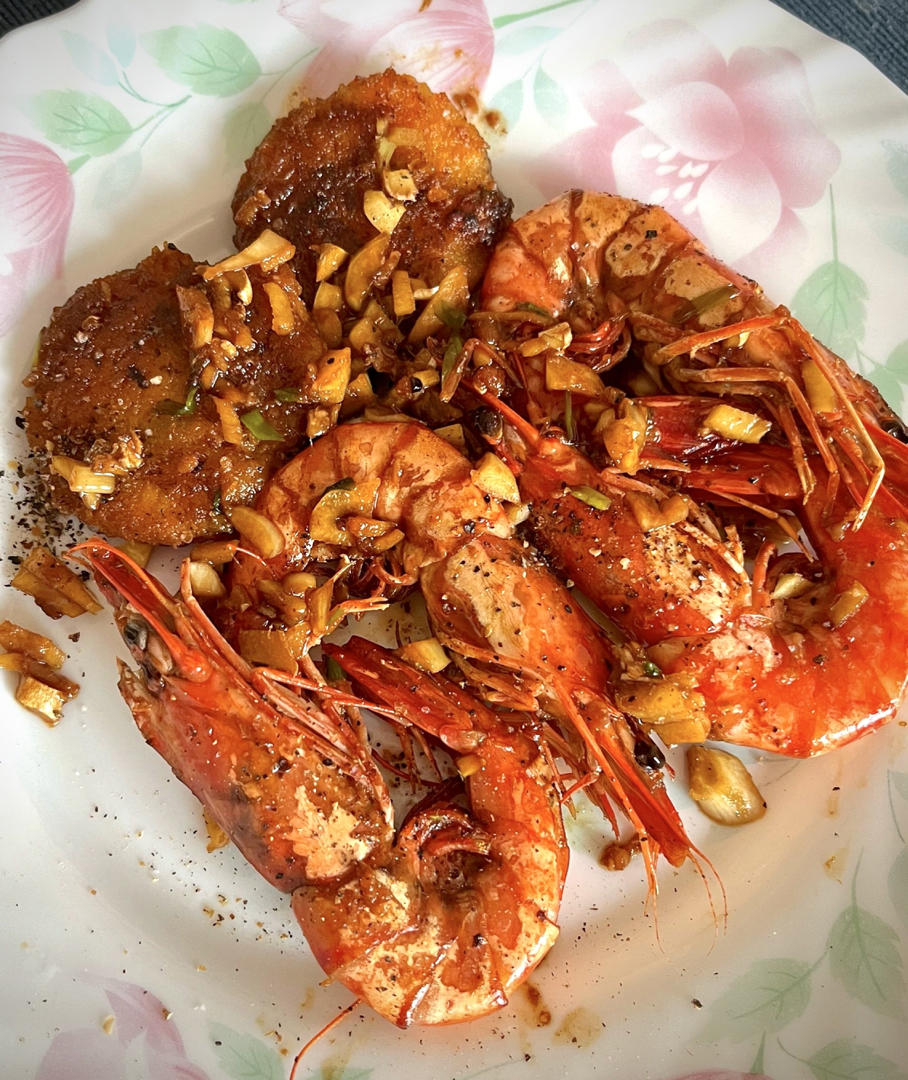 黄油香煎,很香很鲜,海捕大虎虾。顺道还有两个鲜虾墨鱼饼✌️