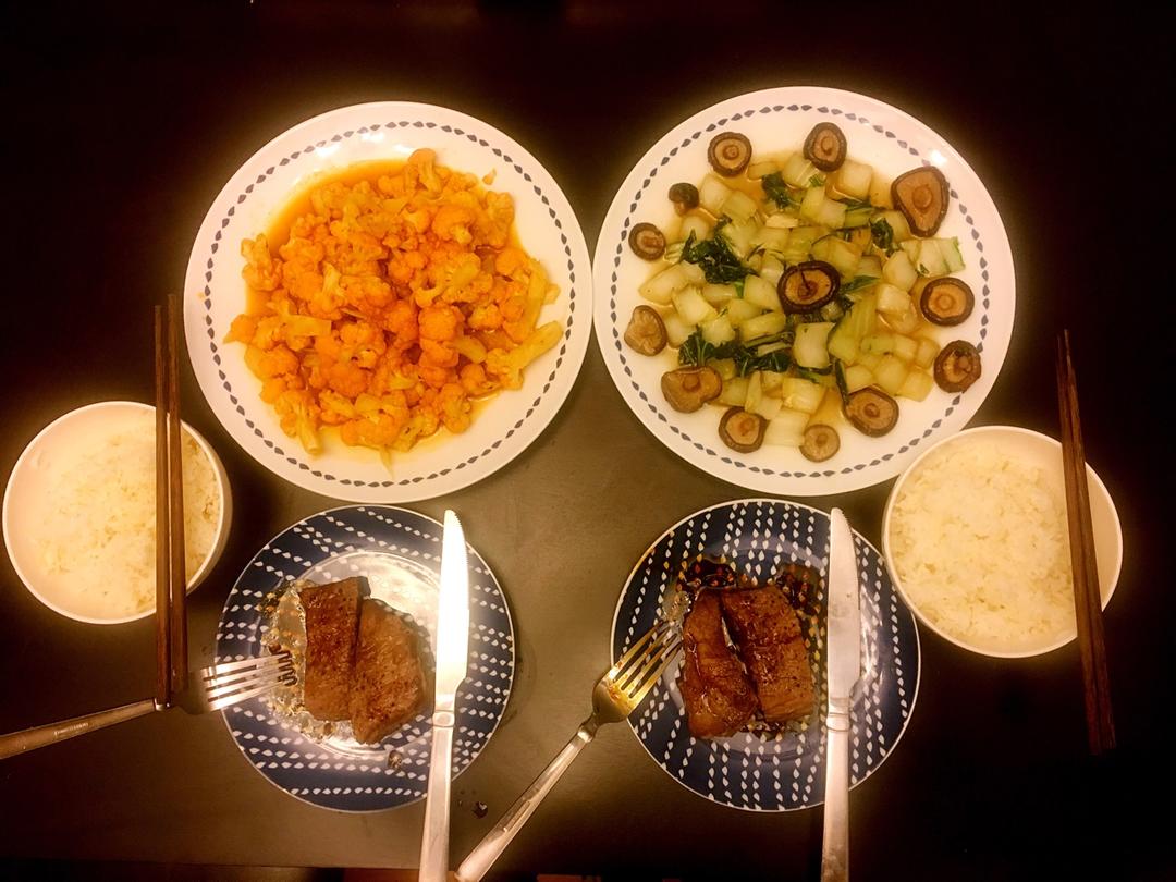 晚餐:煎牛排、番茄菜花、小香菇菜心、二米饭