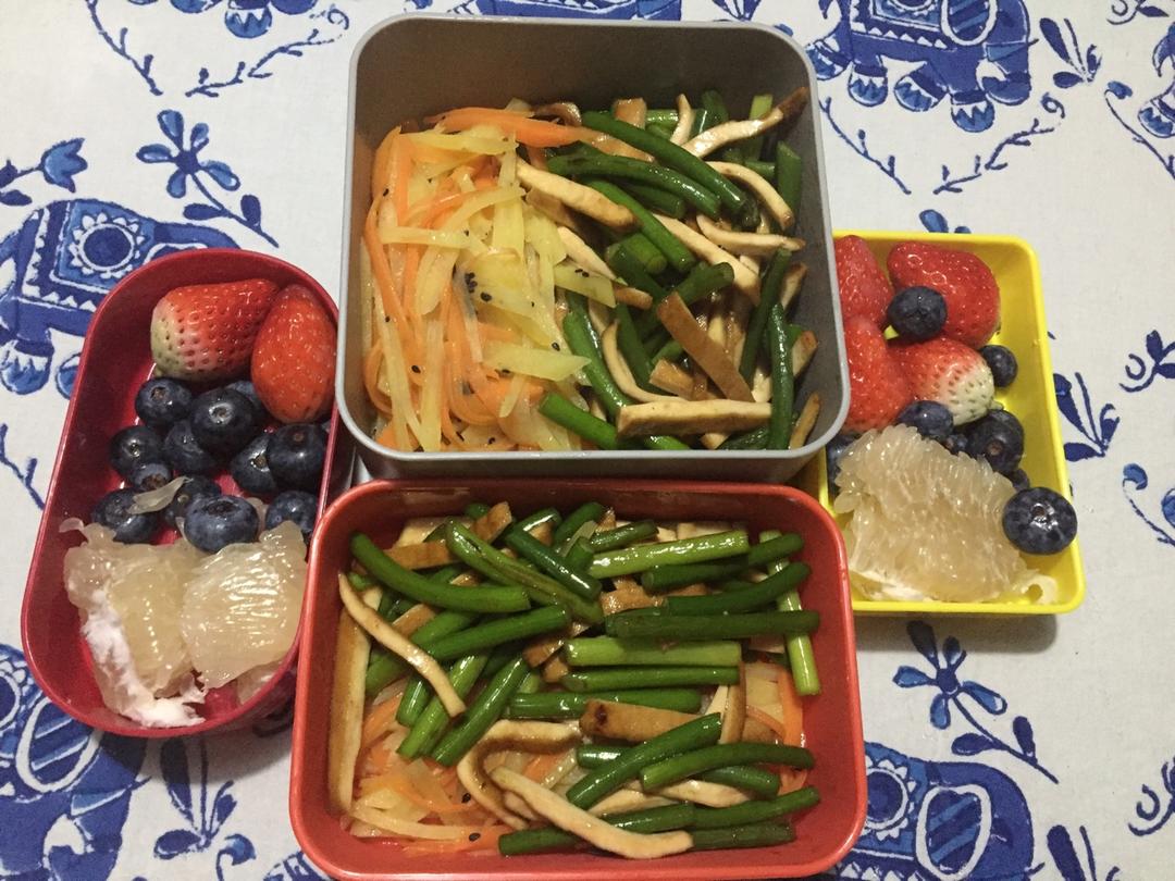 蒜苔炒豆干、土豆胡萝卜丝,还有一人一罐肉蒸蛋盖饭,水果是草莓蓝莓柚子一丢丢。周末愉快!昨晚做蛋糕准备了一小撮黑芝麻,只用...