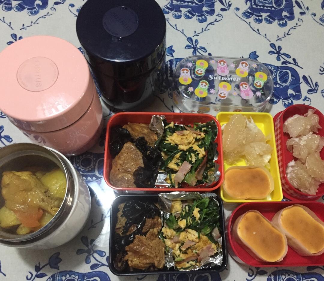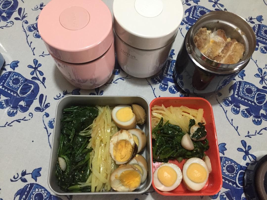 跟平日差不多一样时间起来,炸完猪排有切件和洋葱一起煮了做成猪扒盖饭,另外炒了菠菜土豆丝,也就这样,忙得早餐都只吃汤泡饭了...