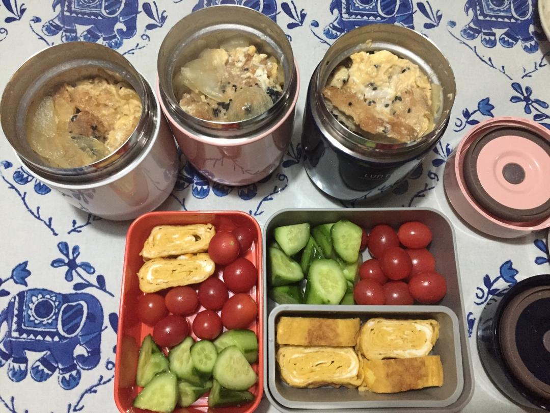睡过头了,还好猪排昨晚就炸好了。猪排洋葱盖饭、蛋蛋、番茄、黄瓜,外加一人一个豆沙饼。小朋友跟我说,吃完下午一点多困倦到不...