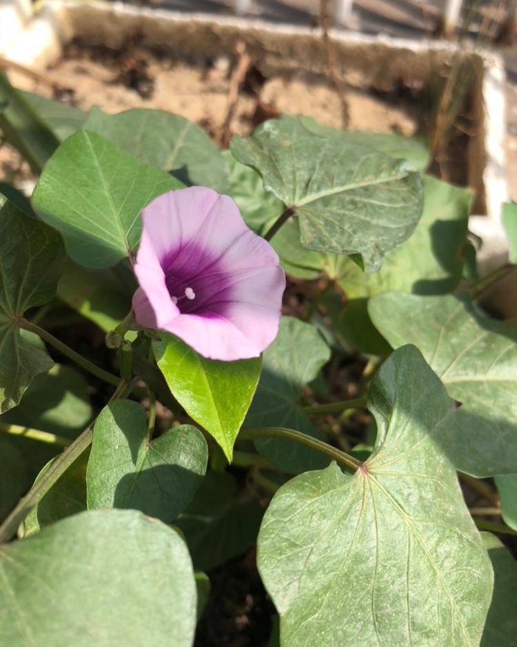 阳台中的地瓜叶里面开了一朵花