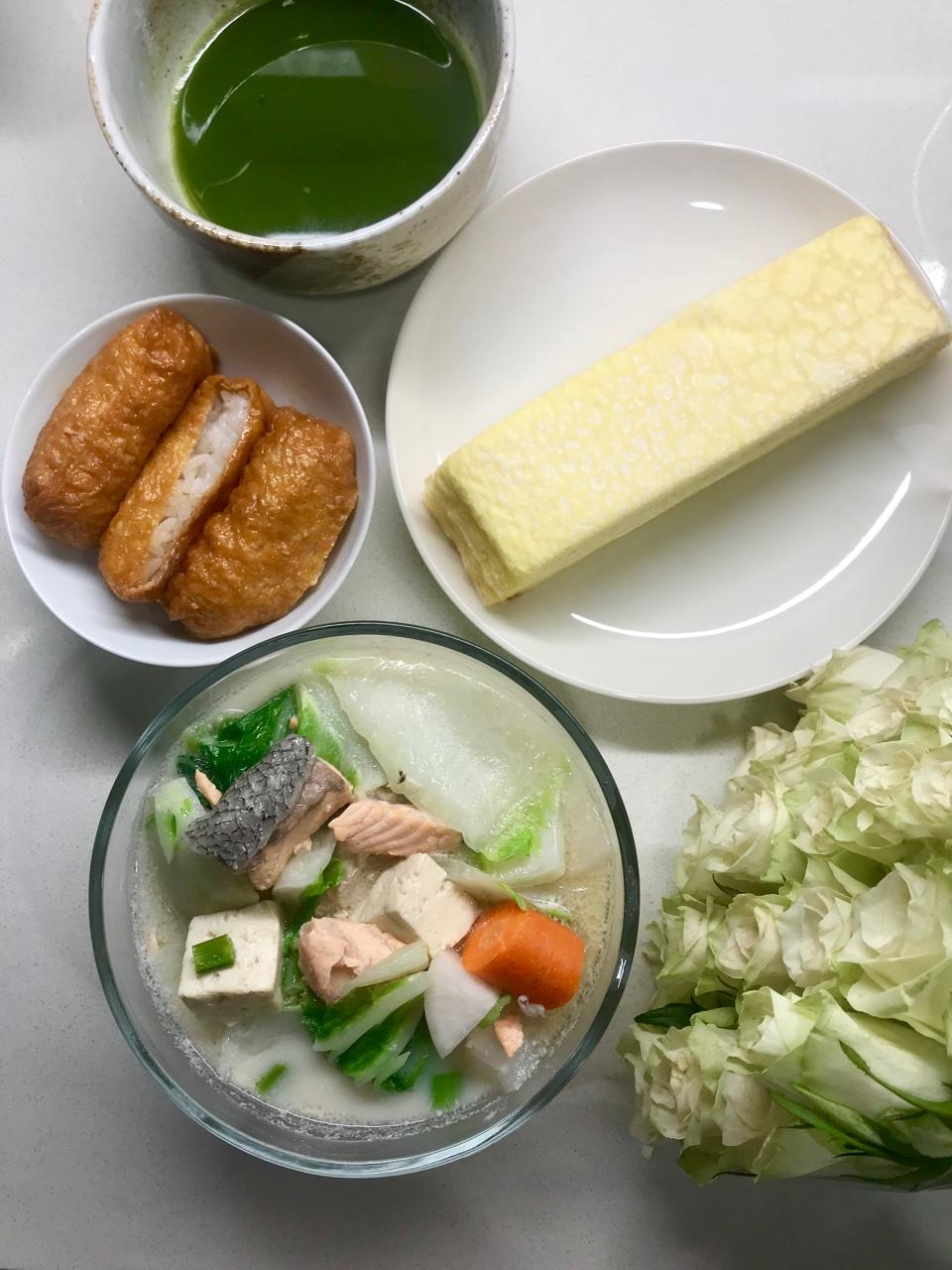 三文鱼豆乳锅*千层蛋糕*豆皮寿司*浓抹茶*非洲玫瑰