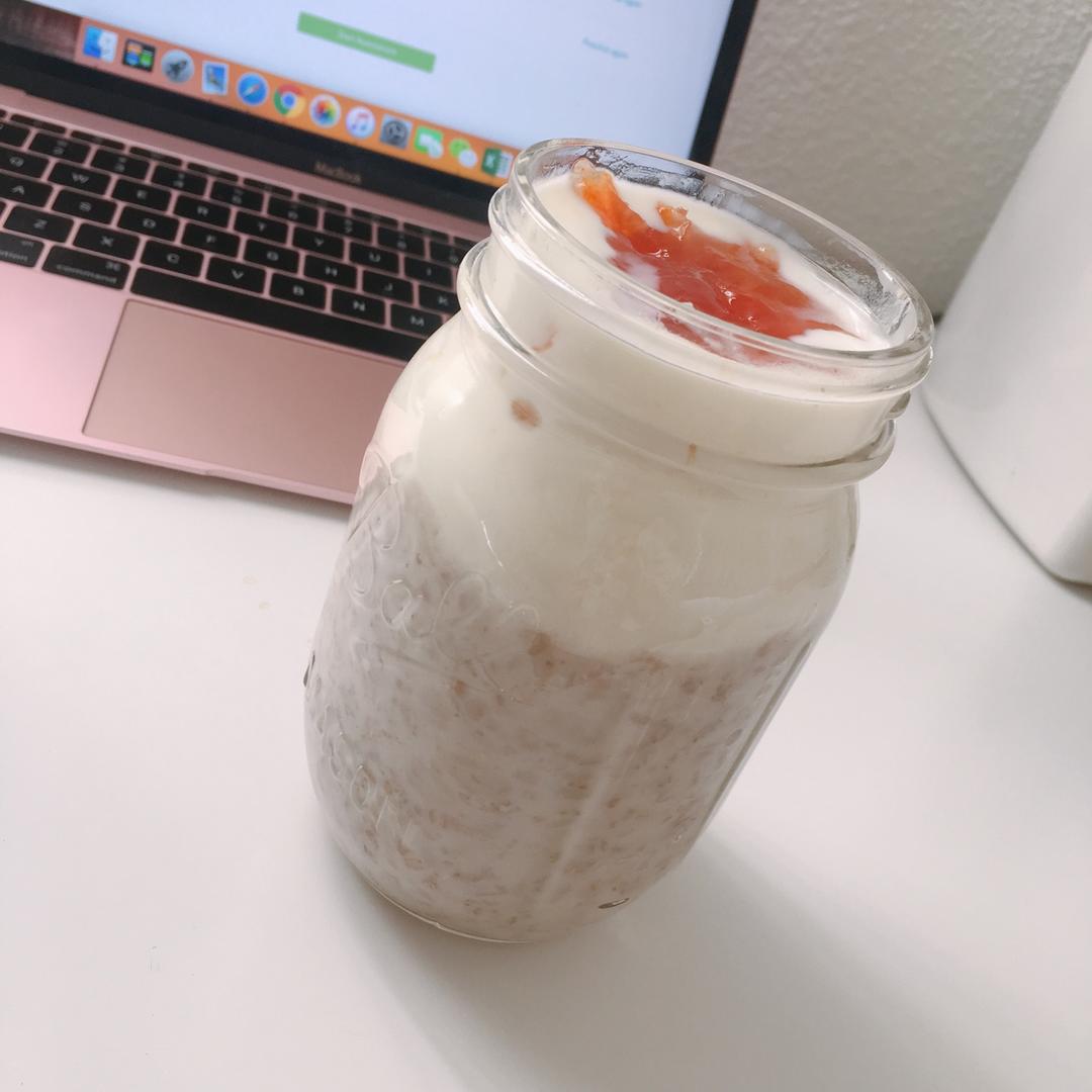 overnight oatmeal真的快手又好吃!!加了无糖酸奶和西柚果酱!!