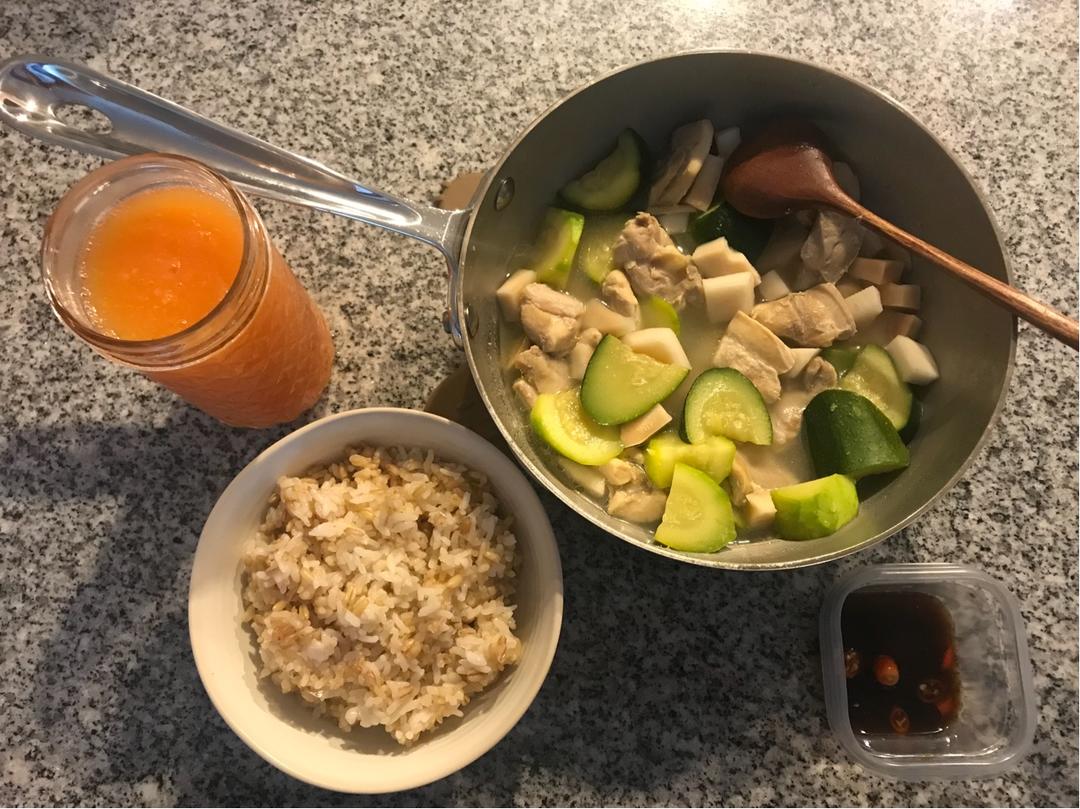 椰子鸡,里面加了西葫芦,配杂粮米,木瓜汁和小米椒青柠沾碟,小米椒用的还是之前做的泡椒,这个椰子鸡我什么配料都没有……然后...
